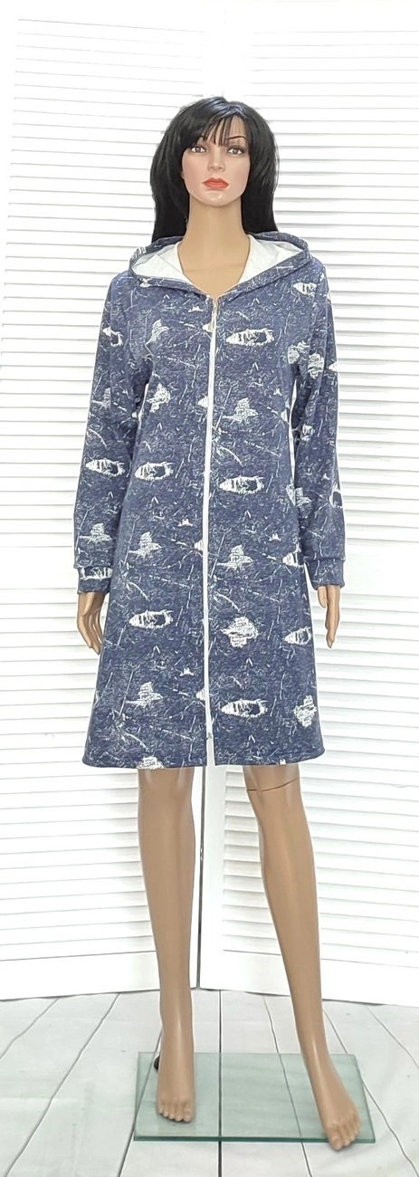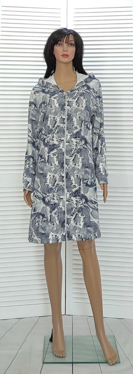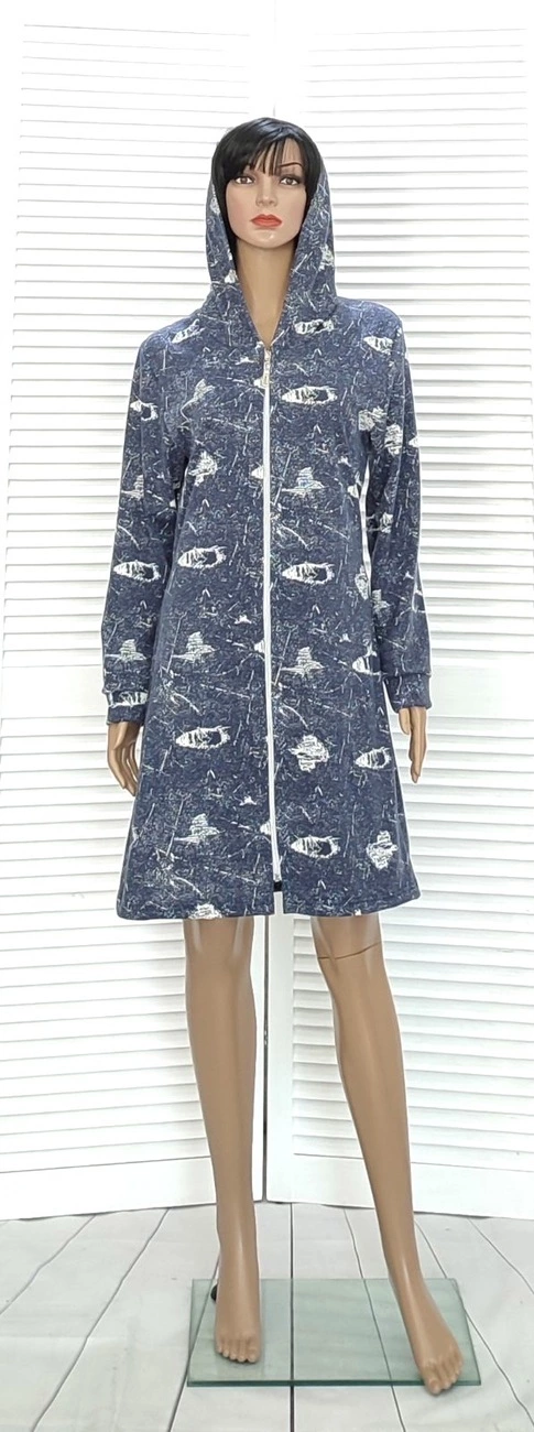 Домашний женский джинсовый халат из двухнитки на молнии.Халат теплый,удобный и практичный.Он прослдужит Вам долгие годы.