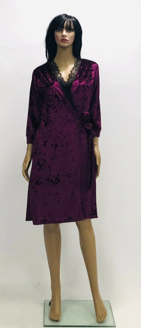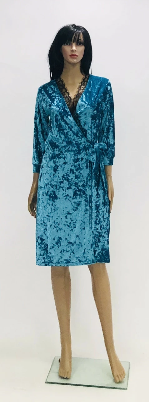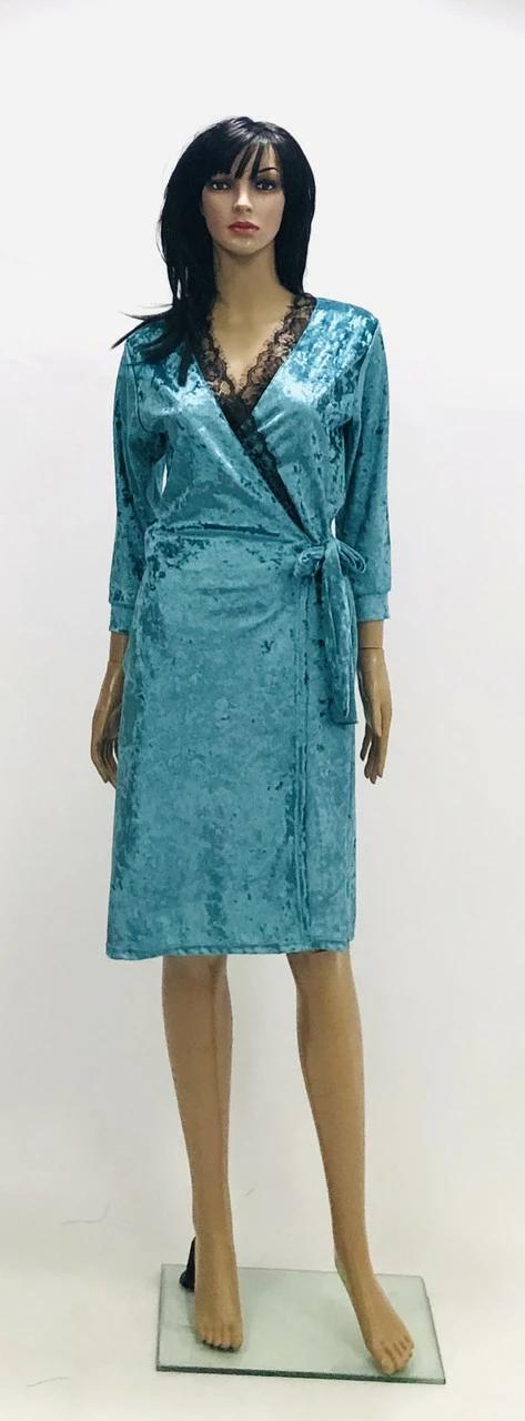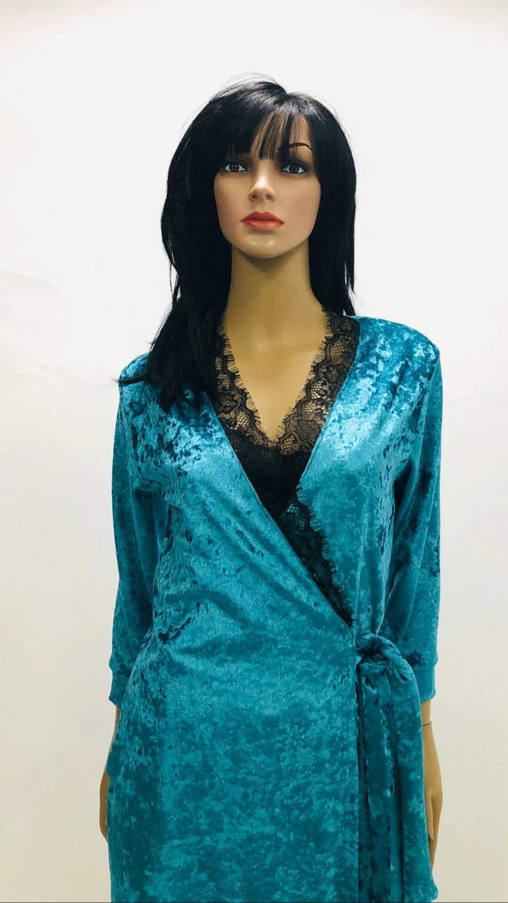 Хаплат на запах из мраморного велюра и украшенный красиво мягким черным кружевом.Этот халат украсит Ваши выходные.
