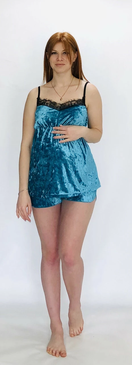 Комплект пижама топ и шорты велюровый с кружевом для беременных.Очень красивый и нежный комплект топ с застежкой для удобного кормления малыша,кружево очень мягкое,свободная резинка на шортах.В набор можно подобрать халат по цвету комплекта.