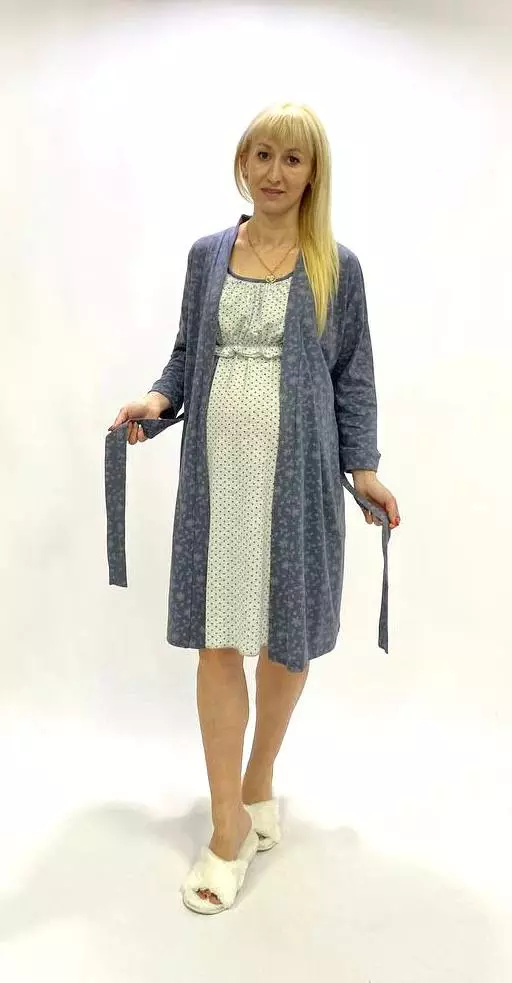 красивый комплект для беременных мам и кормящих.Прекрасный вариант в роддом.Халат с двумя карманами и поясом.Ночная сорочка свободного кроя,на груди двойная ткань,верхный слой на мягкой резинке для кормления,нужно просто поднять,очень удобная модель для кормления.
