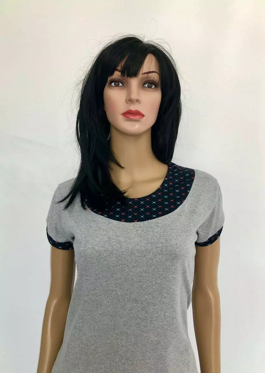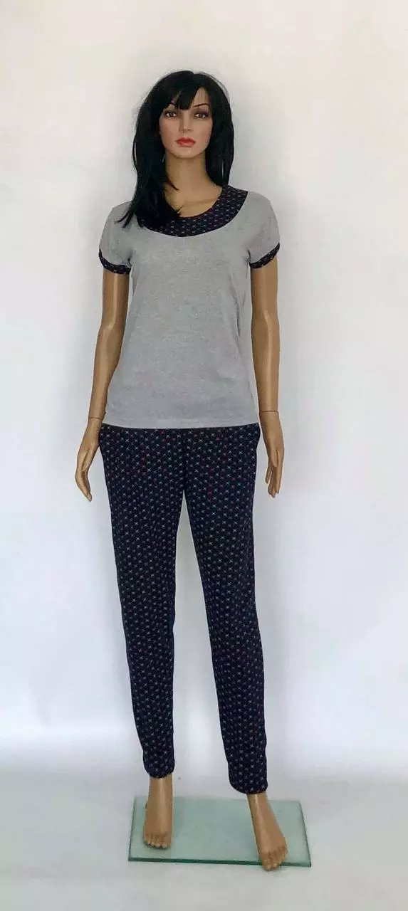 Пижама женская с бруками и футболкой Украина.Легкий женский комплект для отдыха и сна-это футболка и брюки,изготовленные из трикотажной натуральной ткани(100%) хлопок.Свободный елегантный крой,красивое сочетание серого цвета с контрастным трикотажом делают ету модель необыкновенно ефектной.Серая однотонная футболка оформлена кокеткой другого цвета из такой же ткани пошиты брюки.Брюки с вточными карманами по бокам,внизу немного заужены,длинна брюк до щиколотки.