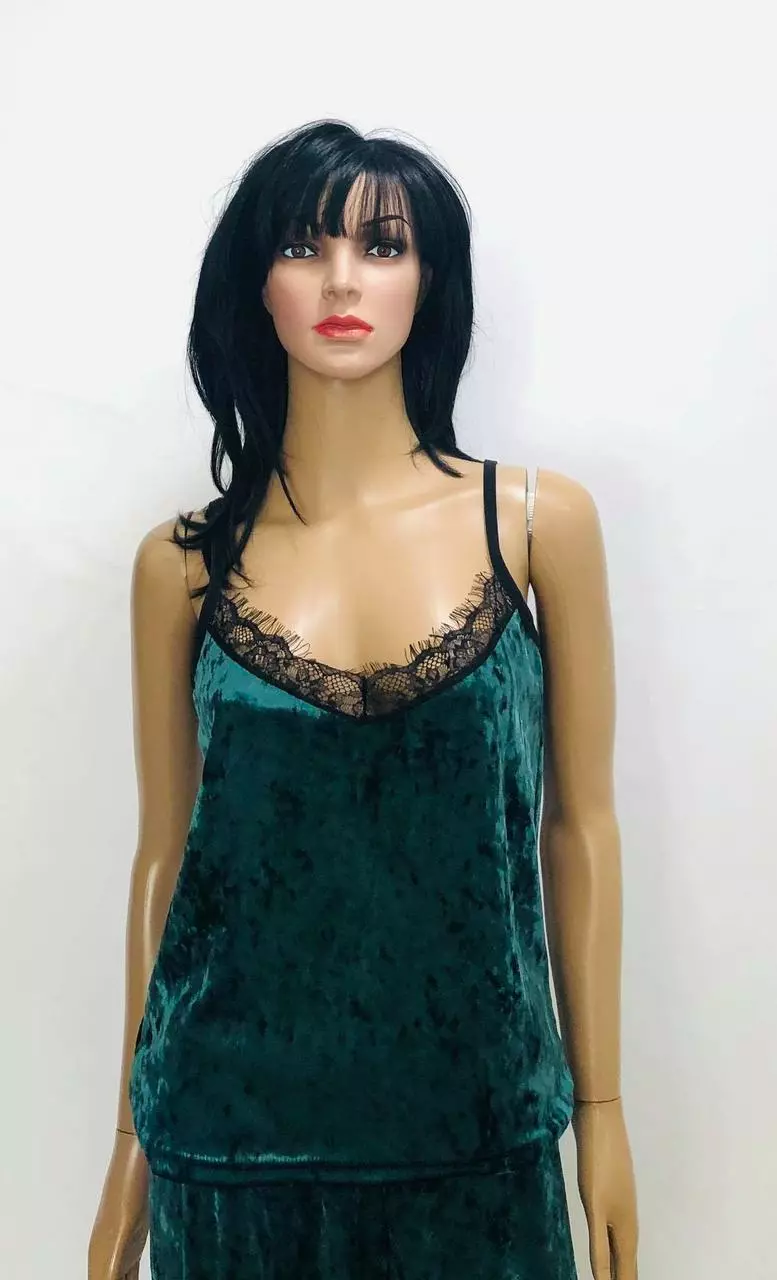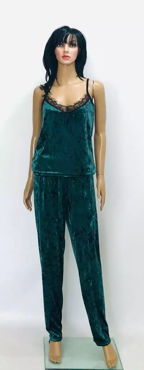 Одежда для дома и сна велюровая.Комплект состоит из топа и штанов,пошит из немного еластичного мраморного велюра ткань с коротким ворсом и нежным отливом.В таком комплекте дома Вы всегда будете выглядить романтично и женственно.Майка свободная и не с глубоким вырезом обшитым шикарным хлопковым фурнитурным кружевом на тонких еластичных лямках